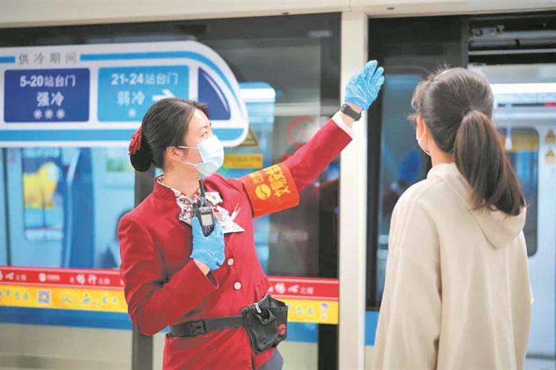 此外,地鐵“紅綬帶”文明引導員(如圖)在站廳、站臺和車廂內持續開展文明引導、車廂(站)執法、日常巡視,引導乘客不亂扔雜物、不隨地吐痰、不損壞公共設施、不躺臥公共座椅等,助力打造“最干凈地鐵”軟環境,將乘坐地鐵打造成市民出行的最佳選擇。(孫倩茹 圖文報道)