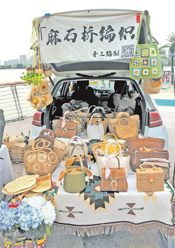 “想著做點什么,補貼一點家里”,艷艷在2020年疫情發生之后就開始了第一次擺攤,最初是在步行街租了一個固定的攤位,今年看到有朋友做起了后備廂擺攤,她觀望了一陣子覺得很有意思,也加入了進來。“最大的好處是沒什么成本,只要一輛車,有一點自己的貨源就能做起來。”后備廂前支一張桌子,把編織包和皮包分門別類放好,再把織有俏皮圖案的童趣包單獨拿出來掛在車子兩邊,短短20分鐘,一箱子包包在艷艷熟門熟路的布置下,變得錯落有致起來。擺放的過程中,不時有路人上前試背。攤位上,除了擺有收款碼,艷艷還貼出了自己的微信二維碼,不少客戶從線下轉到了線上,從過路客變成了朋友圈里人。“在公司上班比較乏味,下了班到這里看看湖光水色和嬉笑人群,是一件很解壓的事,在這過程中也能認識很多朋友”,艷艷很享受這份舒心愜意。抱著這樣的心態,再熱的天出攤,她也不覺得辛苦。