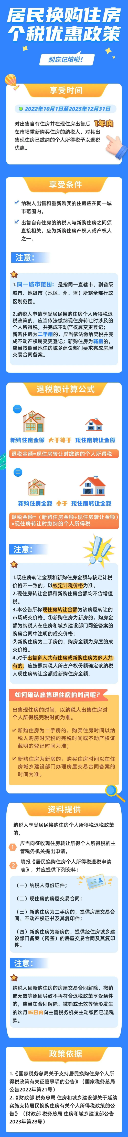 根據(jù)公告,對出售自有住房并在現(xiàn)住房出售后1年內(nèi)在市場重新購買住房的納稅人,對其出售現(xiàn)住房已繳納的個人所得稅予以退稅優(yōu)惠,公告執(zhí)行至2025年底。