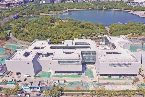 從空中俯瞰無錫美術館,其形似太湖石的建筑造型已躍然于尚賢湖畔。內部設計也透露出濃厚的藝術氣息。