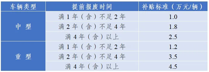 今年老舊營運貨車報廢更新的補貼標準與去年基本保持一致,按照報廢車輛類型、提前報廢時間和新購置車輛動力類型等,實施差別化補貼,具體如下: