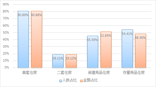 從貸款群體來看,剛需與改善型住房需求職工分別占貸款總?cè)藬?shù)的23.71%和59.91%。從單位性質(zhì)來看,以城鎮(zhèn)私營企業(yè)及其他城鎮(zhèn)企業(yè)職工為主,貸款筆數(shù)和貸款金額占比分別為52.08%、52.9%。從購房面積來看,職工貸款購買90(不含)-120㎡房屋居多,占貸款總?cè)藬?shù)的43.3%。從主借人繳存基數(shù)來看,貸款主要以中、低收入職工為主,分別占貸款總?cè)藬?shù)的28.58%、70.69%。從貸款類型來看,純公積金貸款和組合貸款占比分別為78.44%、21.56%。從貸款結(jié)構(gòu)來看,首套住房公積金貸款職工占貸款總?cè)藬?shù)的80.89%,二套住房公積金貸款人數(shù)占19.11%。具體放貸結(jié)構(gòu)如下: