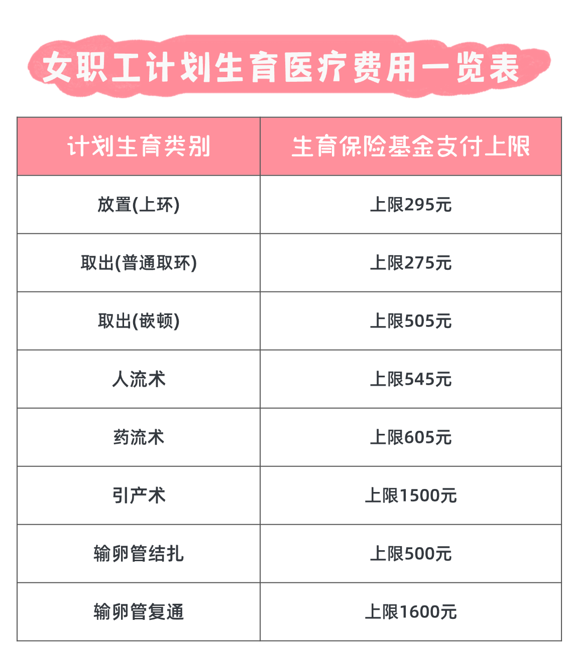(3)計劃生育醫療費:女職工實施放置或者取出宮內節育器、人工流產術或者引產術、輸卵管結扎以及復通手術等,所發生的符合生育保險規定的醫療費用,以及在手術和住院期間,因實施計劃生育手術引起的并發癥的醫療費用。